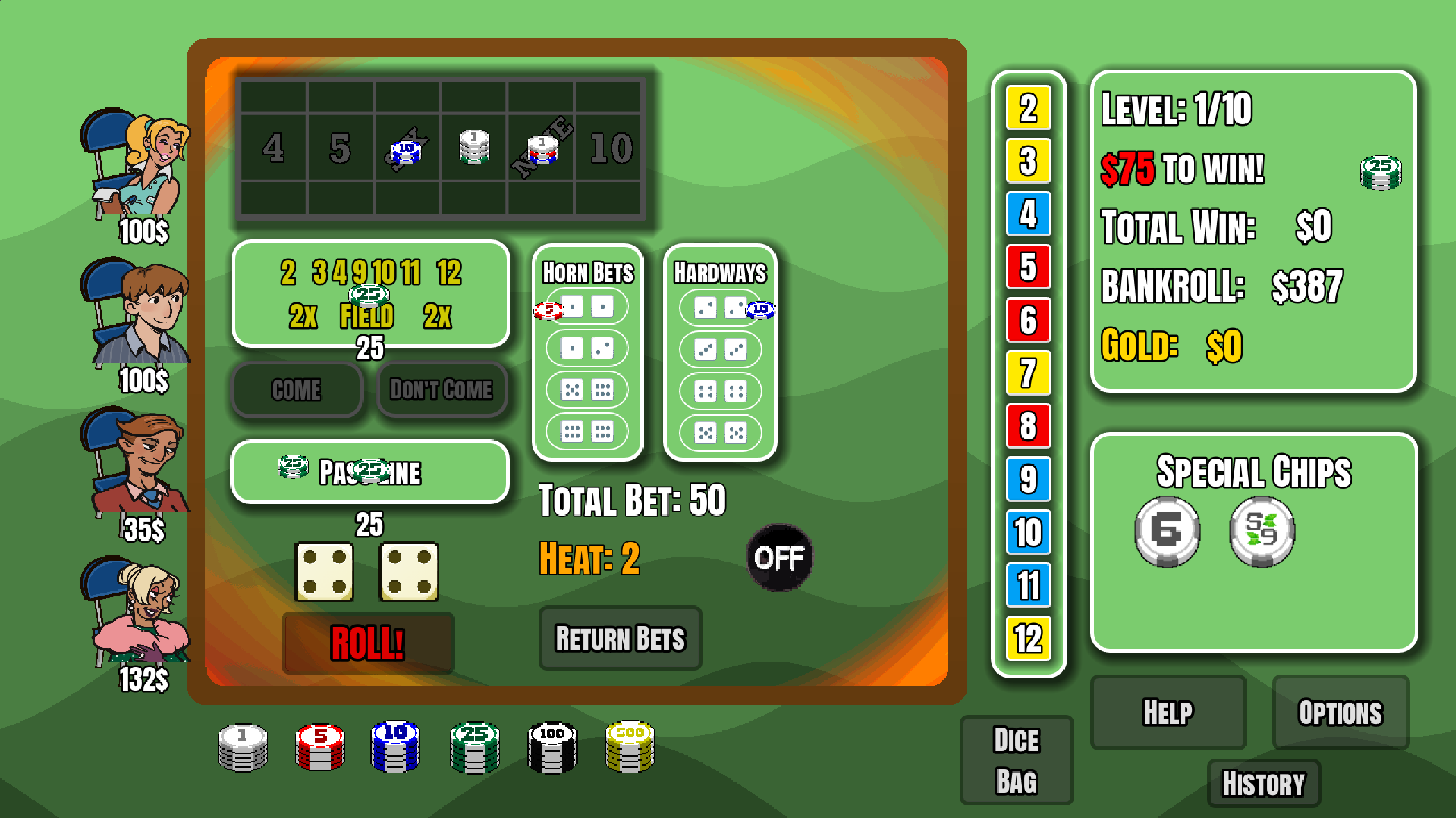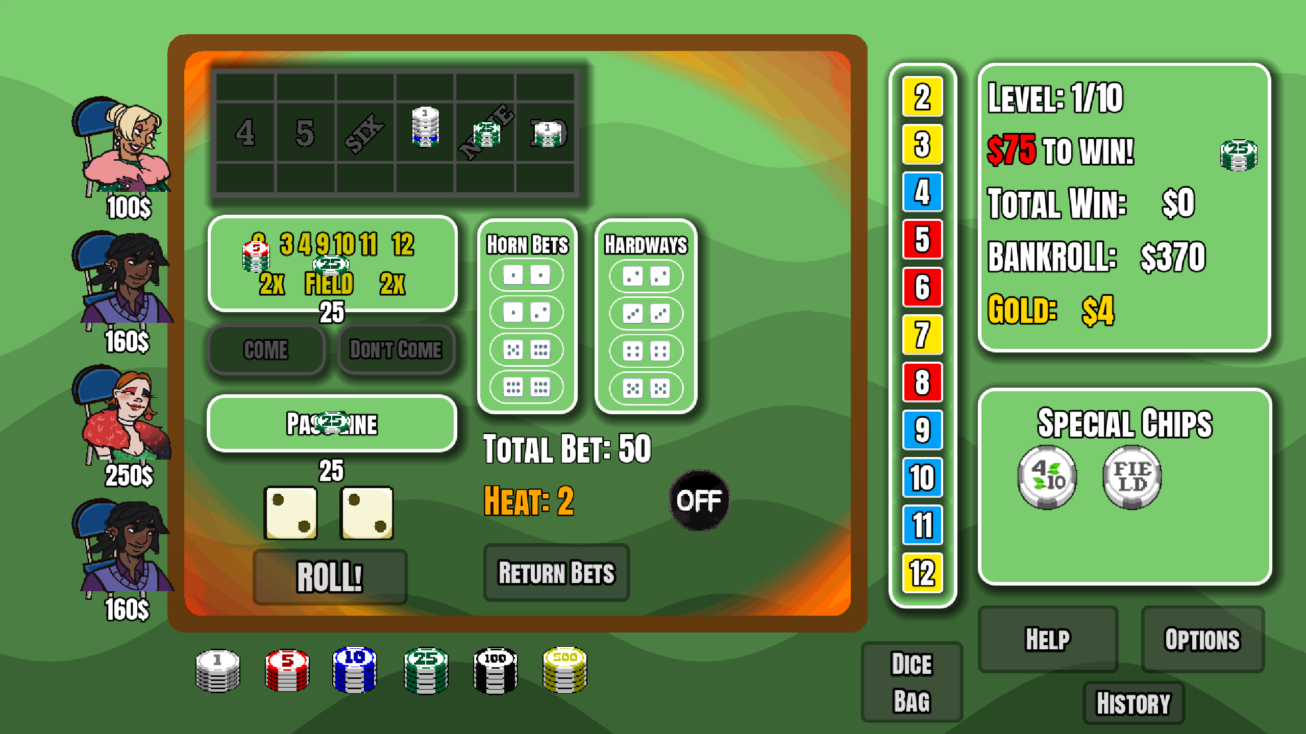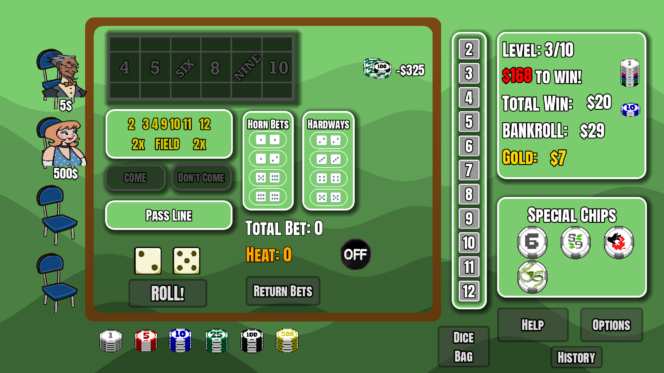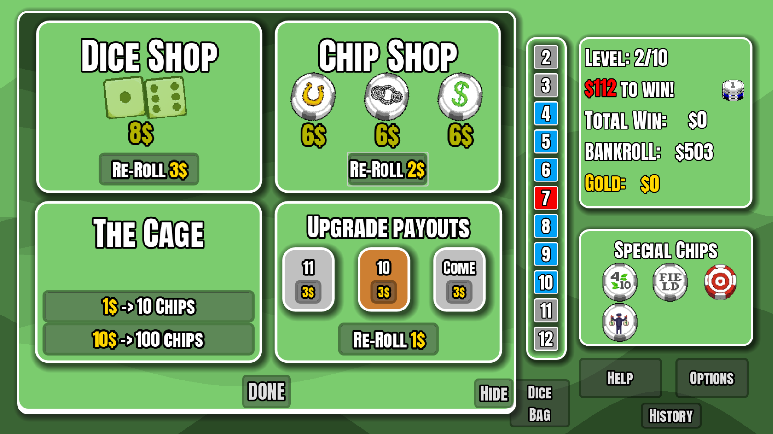 This is 6 ways to 7, a high-stakes roguelike twist on the classic dice game Craps! 6 Ways to 7 combines the hard choices of a roguelike, with the push your luck gameplay of craps into a fun package that won't break the bank!